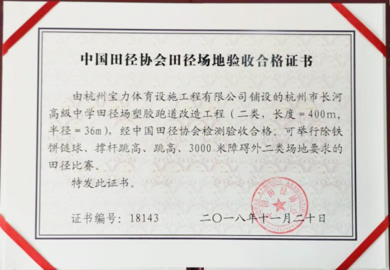 由杭州寶力體育設(shè)施工程有限公司(以下簡稱:寶力體育)鋪設(shè)的杭州市長河高級中學(xué)藍色環(huán)保塑膠跑道現(xiàn)已完美竣工,場地為400米標(biāo)準(zhǔn)塑膠跑道,經(jīng)中國田徑協(xié)會檢測驗收合格,可舉行二類場地要求的田徑比賽!