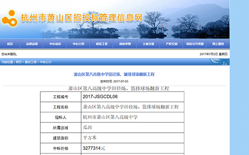 2017年7月3號(hào)中標(biāo)蕭山區(qū)第八高級(jí)中學(xué)田徑場(chǎng)、籃排球場(chǎng)翻新工程
