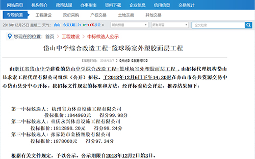 2018年12月6號(hào)中標(biāo)岱山中學(xué)室外籃球場(chǎng)塑膠面層改造工程公示