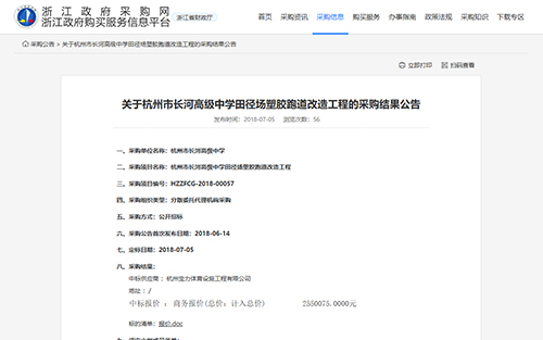 2018年7月5號(hào)中標(biāo)杭州長(zhǎng)河高級(jí)中學(xué)田徑場(chǎng)塑膠跑道改造工程項(xiàng)目公告