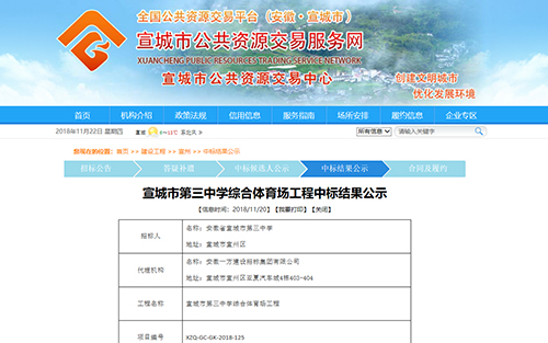 2018年11月20日中標(biāo)宣城市第三中學(xué)綜合體育場(chǎng)建設(shè)工程公告