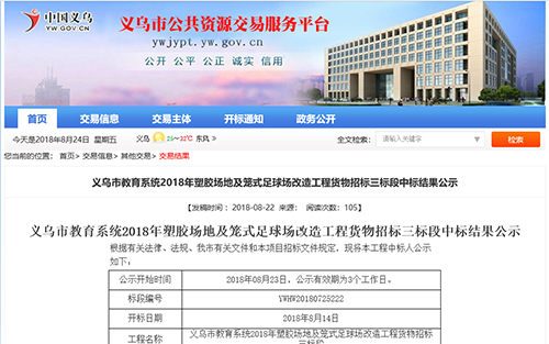 2018年8月22日中標(biāo)義烏市教育系統(tǒng)塑膠場(chǎng)地及籠式足球場(chǎng)改造工程項(xiàng)目公示