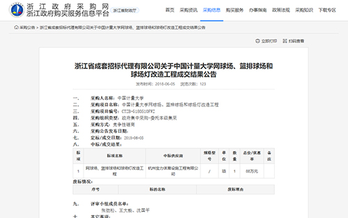 2018年6月5日中標(biāo)中國(guó)計(jì)量大學(xué)網(wǎng)球場(chǎng)、籃排球場(chǎng)和球場(chǎng)燈改造工程公告
