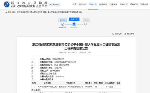 2018年6月1日中標(biāo)中國(guó)計(jì)量大學(xué)車庫(kù)出口玻璃亭油漆工程公告