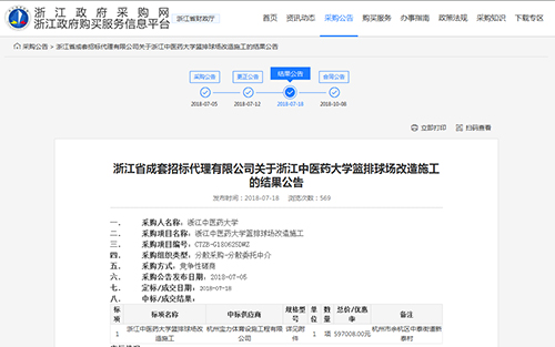 2018年7月18日中標(biāo)浙江中醫(yī)藥大學(xué)籃球場(chǎng),排球場(chǎng)改造施工項(xiàng)目公告