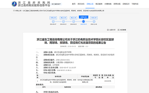 2018年9月5日中標(biāo)浙江機(jī)電職業(yè)技術(shù)學(xué)院長(zhǎng)安校區(qū)籃球場(chǎng),網(wǎng)球場(chǎng),排球場(chǎng),田徑場(chǎng)燈光改造項(xiàng)目公告