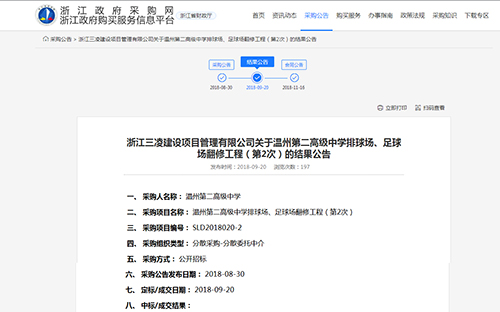 2018年9月20日中標(biāo)溫州第二高級(jí)中學(xué)排球場(chǎng),足球場(chǎng)翻修工程公告